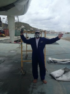 I hate working with this stuff, but today we managed to repair the trailing edge of the keel, touch up bottom paint spots all around the boat, and clean and seal the waterline stripes.