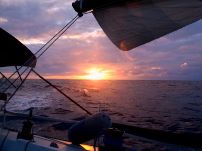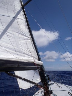 Our first full day under sail. 200 or so miles in – 2000 or so to go. Winds reasonably consistent in a 12-17 knot range. The jib was unfurled and furled a few times.