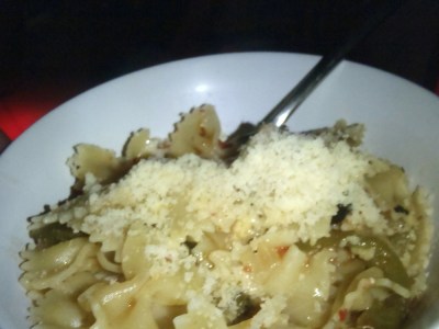Breakfast was a scrambled egg wrap seasoned with a cumin and pepper curry. Lunch a ham and cheese wrap with spicy aioli garnish. Dinner was Greek Chicken pasta – a white wine garlic, olive and caper butter sauce and fresh grated parmesan.