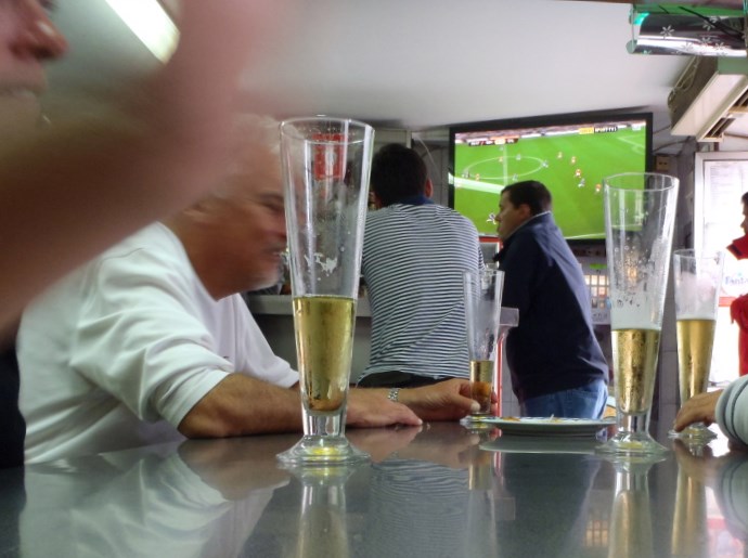 After wandering a bit, we found a small neighborhood bar with a big screen TV. A big soccer match between Chelsea and Benefica was on tap. We joined the crowd and cheered for Benifica. Beer and batavas bravas (spicy potatoes) softened the blow of Benefica’s heartbreaking loss. Despite outplaying Chelsea the entire game, they were beaten on a sloppily defended goal during the last penalty minute of the game.