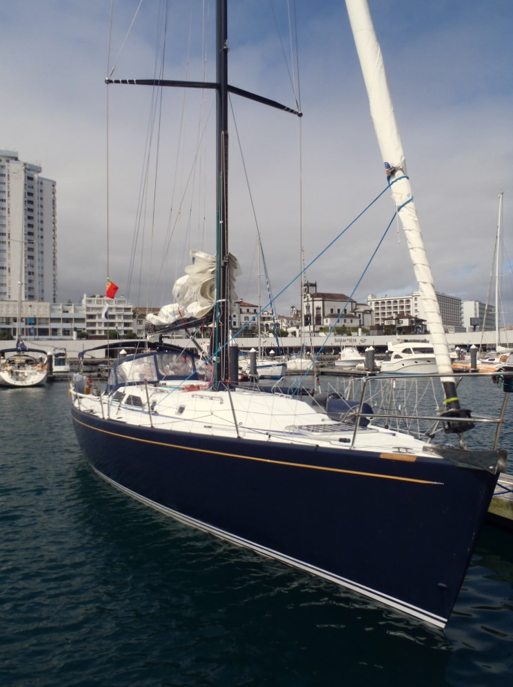 Our passage between the Azore Islands was notable for the three man crew and 2 hour on / 4 hour off watch rotation. I was surprised at the difference. We were all accustomed to the rhythm of life aboard with a the four man rotation. Our crew usually awaken on our own – standing by and ready at the watch change. Everyone had to be prodded awake for their watch during this short island hop. We sailed most of the way, motoring only to charge batteries and for a few short lulls in the wind. It started with a pleasant sunny sail around Pico Island. Once out of the island’s protection we were in shifting gusty 16 -25 knot winds with big confused swells most of the night. The short crew*, quick rotation, and weather kept Captain Jim even more on edge than usual. This may have contributed to his decision to give the crew shore leave in Ponta Delgada Marina.