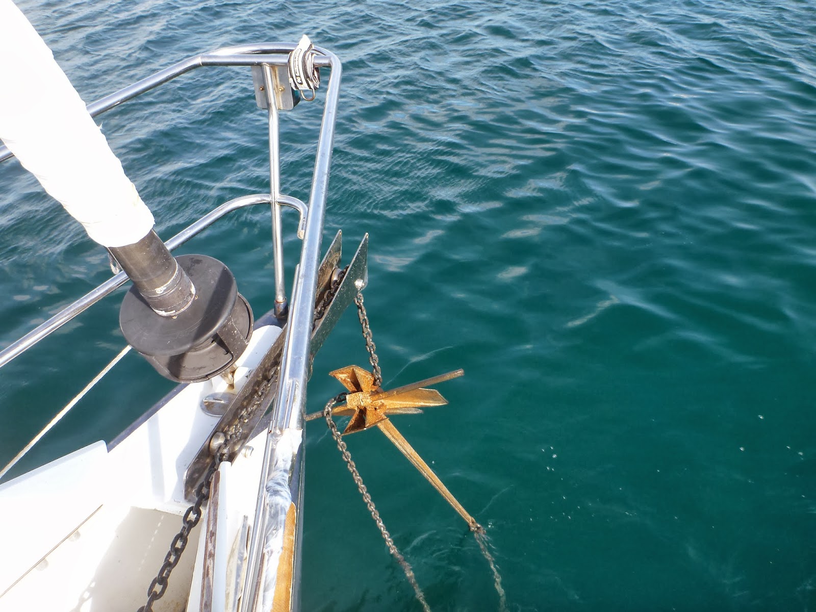 Its not often that you see something like this. I guess during the night the wind died and the boat swung entirely around dragging the anchor chain with it across the bottom until it hooked the anchor. I was more than a bit surprised to see the anchor come up with 30 feet of chain still in the water. Once I figured that part out, I started thinking about what would have happened if the wind came up after the change in direction. I’m thinking that anchor probably wouldn’t have been doing a very good job, and we could have been very unhappy!Raise the Anchor!