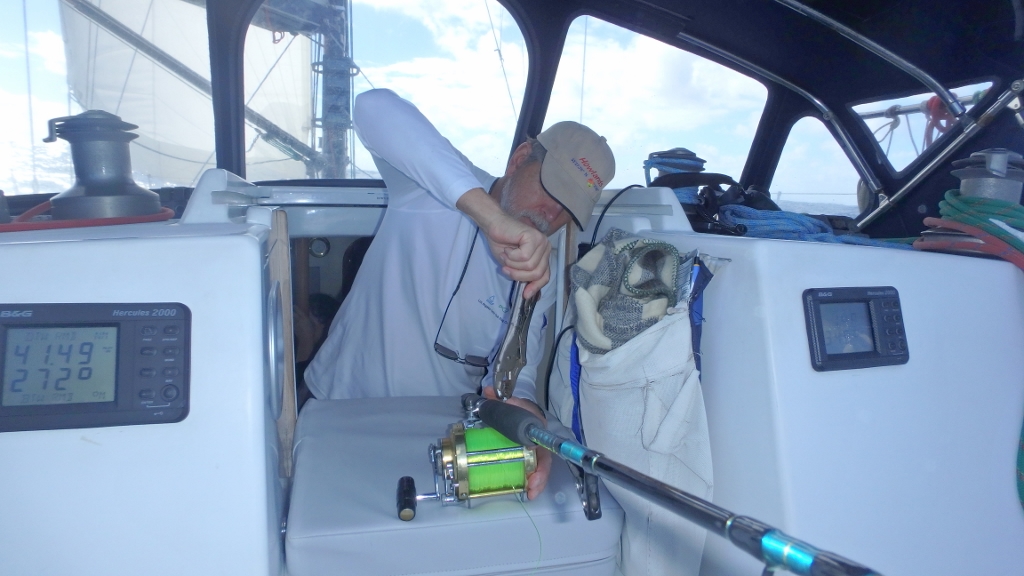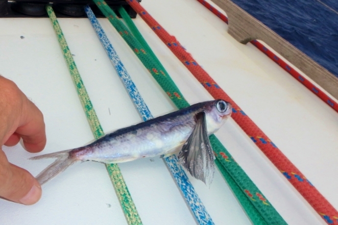 Jim added a hand line on the port side trolling a squid, but no luck. My flying fish was the only catch of the day.
