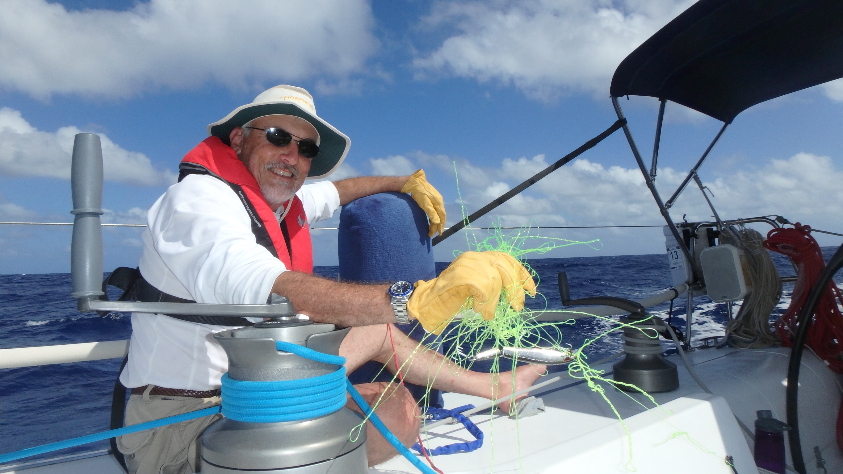 Redeployed the purple squid, this time with a shorter line as I was tired of reeling in miles of empty line. It spent most of the afternoon bouncing of the top of the swell behind us (Strike Three).