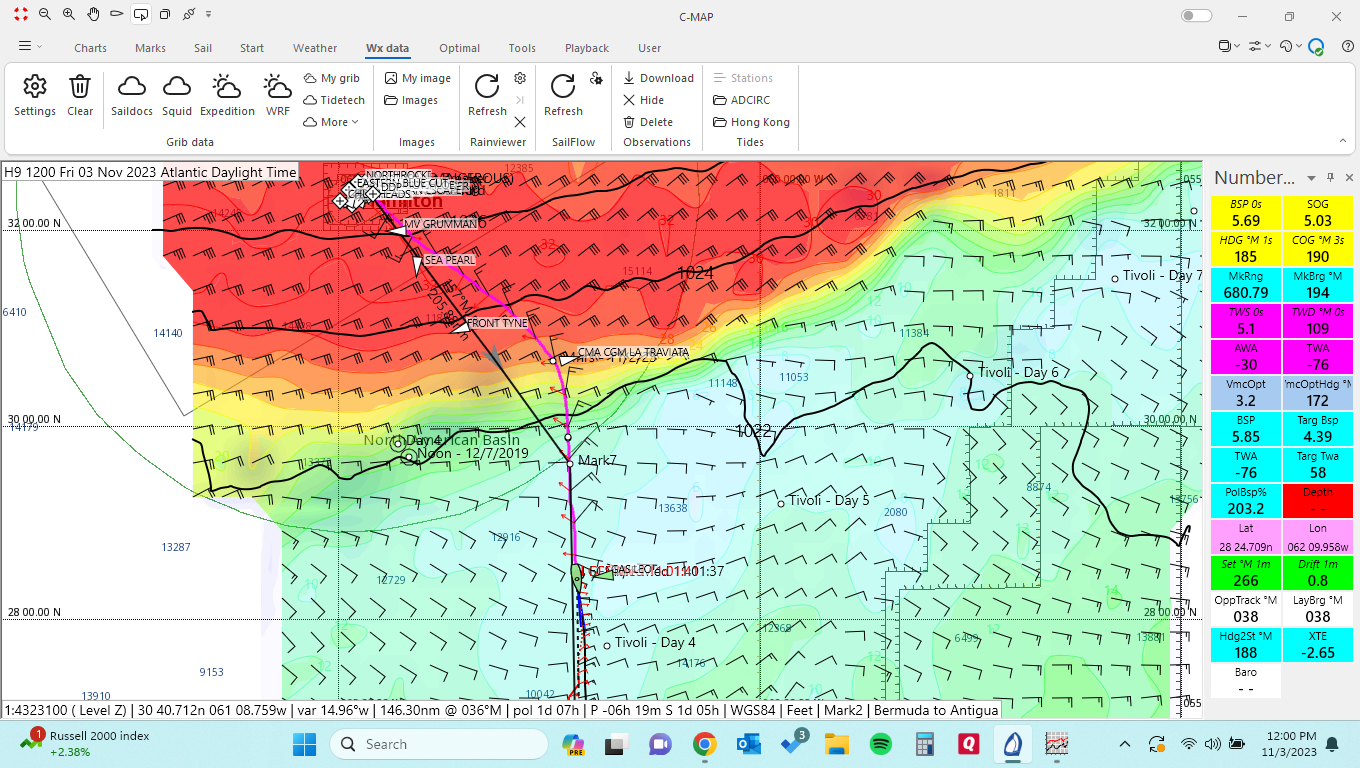 We left Bermuda on Nov 1st 2 hours after my brother landed. Our goal was to leave right after one system blew through, betting that we could stay ahead of the next and reach a well defined (and forecasted) weather “fence” with the storms to the North and fine sailing to the south.